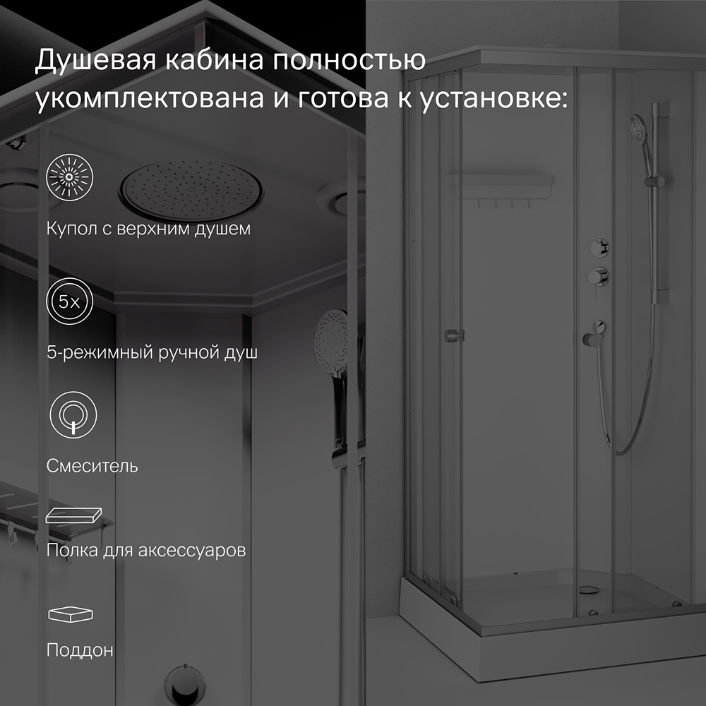 Одинарные ролики обеспечивают легкое и бесшумное открывание. Кабина оснащена 5-режимным ручным душем стильным смесителем и компактной полкой на которой разместится все необходимое. Герметичная конструкция защищает помещение от брызг воды.