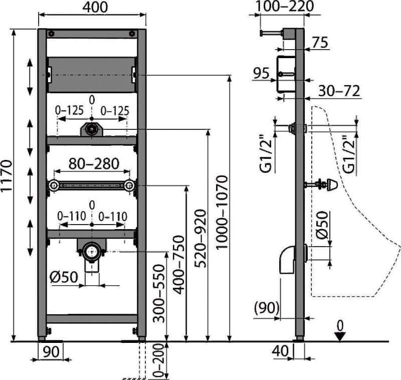Водоснабжение с возможностью регулировки от центра 0–125 мм