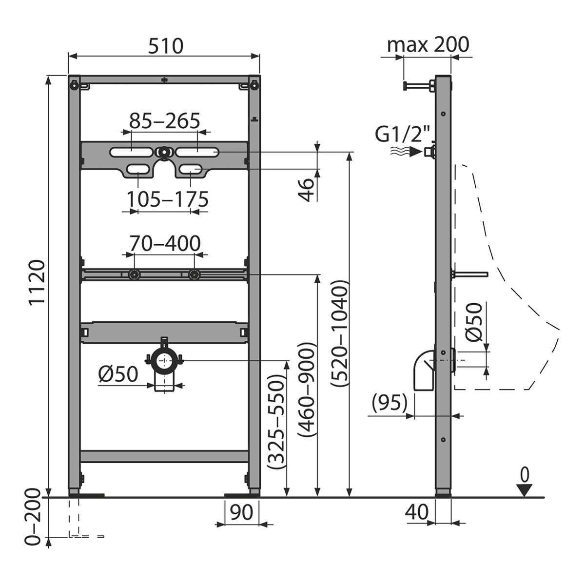 Интервал крепления писсуара 80-280 мм