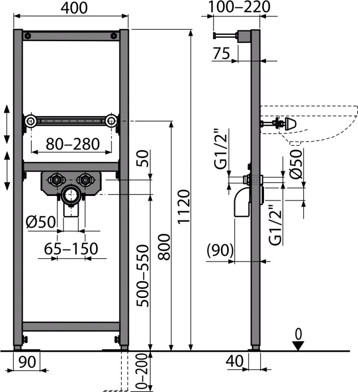 Интервал крепления умывальника 80-280 мм