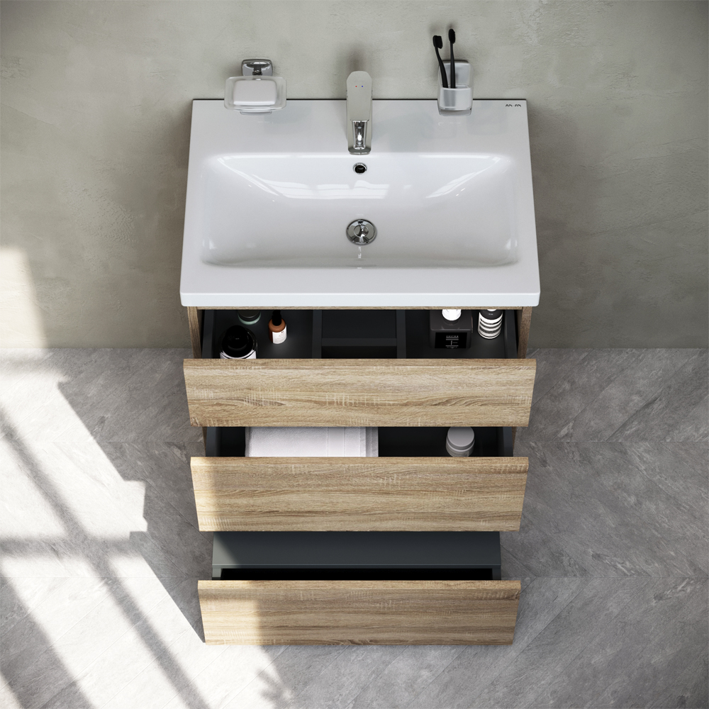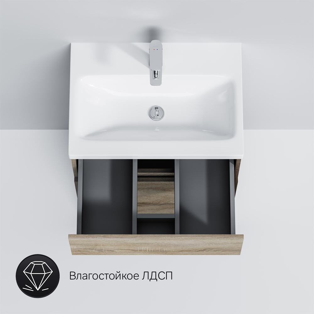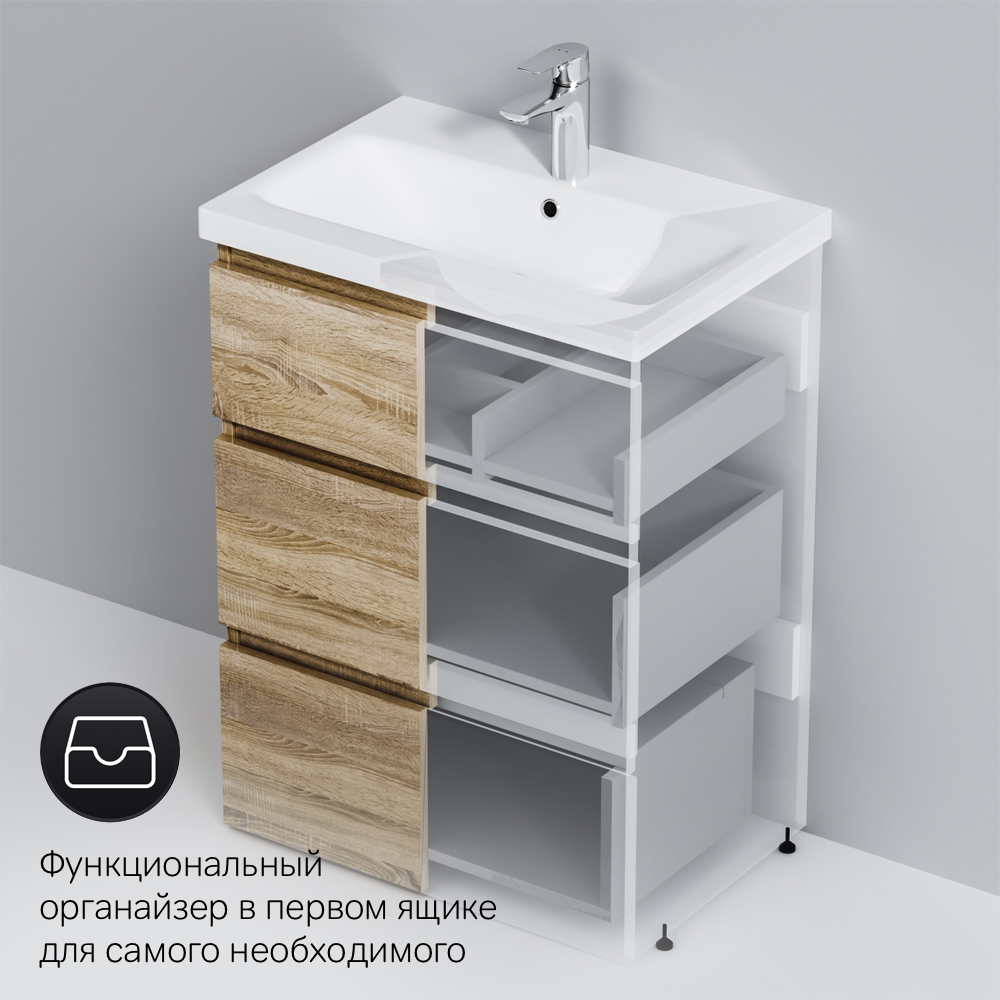 Уникальный нижний ящик базы может быть использован как: выдвижная подставка для детей для удобного мытья рук (выдерживает нагрузку до 60 кг) дополнительная ниша для хранения (экономия пространства ванной комнаты). Ящики с антискользящим покрытием цвета антрацит – европейский стандарт.