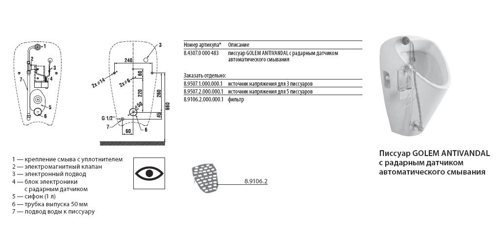 —Писсуар Jika GOLEM ANTIVANDAL 30,5х34х53,5 с радарным датчиком, питание от сети, сифон, уст.компл.