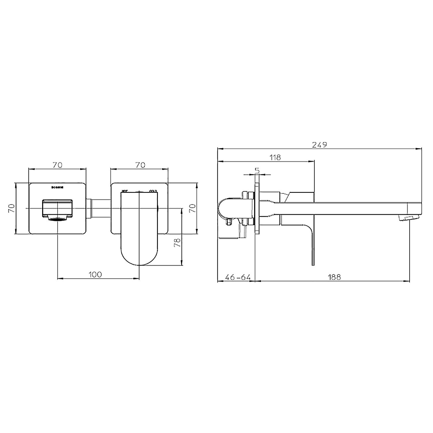 —Комплект Bossini TEO Смеситель для раковины, настенный, встраиваемый, с изливом 18.5 см, черный матовый + Встраиваемая часть однорычажного смесителя (Z00732.073+Z00801)