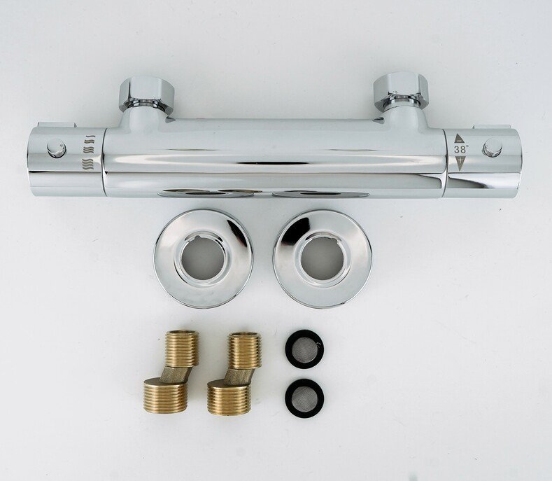 Корпус: латунь кат.A Картридж: двухконтурный ESKO с переключателем (душ-излив в одной рукоятке), ограничитель температуры 38 градусов. Термоэлемент: универсальный с защитной сеткой (vernet) Комплектация: мягкий защитный каркас для транспортировки, защитные сетки и обратные клапаны (интегрированы в корпус), эксцентрики, отражатели.